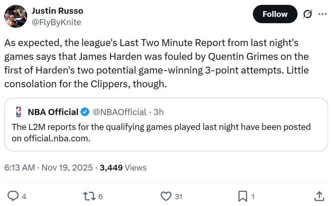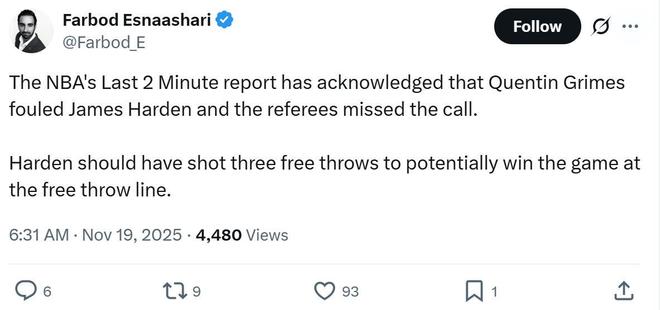 快船队记Farbod Esnaashari吐槽道:“哈登本应获得三次罚球机会,并且有机会通过罚球完成绝杀。”