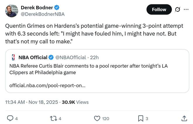 因此赛后主裁Curtis Blair不得不做出回应,他表示之所以没有吹罚是因为裁判当时认定格莱姆斯对哈登的三分出手进行了合法干扰。