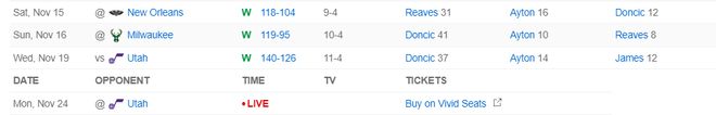 湖人:东契奇33分11篮板8助攻,里夫斯22分10篮板,八寸垒13分6篮板,詹姆斯17分8助攻6篮板。