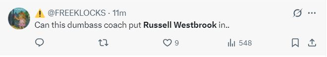 虽然威少上半场的表现很差,但很多球迷还是对克里斯蒂的安排不满,他们认为应该更多让威少登场找状态,当37岁的老将状态不佳时更应该给他时间去找状态。
